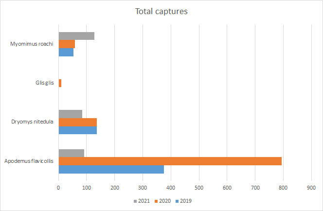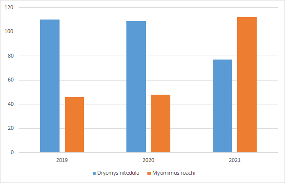 Figure 3. Numbers of Forest and Mouse-tailed dormice captured in 2019-2021.